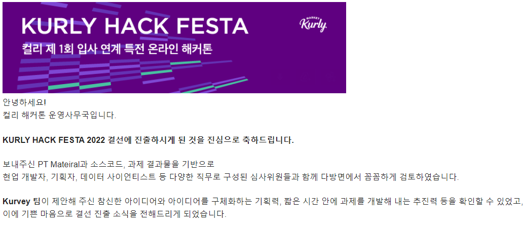 사실 나는 우리 팀이 결선에 진출할 것이라고 생각을 못했어서, 결선 진출 메일을 보고 한참을 눈을 비볐다.