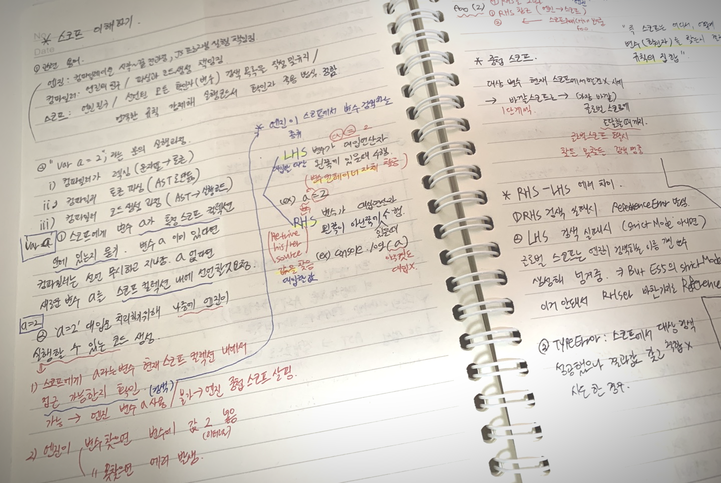 - 변수의 선언은 컴파일레이션 중에 컴파일러가 스코프에 확인하고, 없으면 컴파일러가 변수를 스코프 안에 생성할 것을 요청한다. 값을 할당하는 코드는 엔진이 실행 시에(런타임에서) 스코프에서 변수를 검색하여 값을 대입한다.