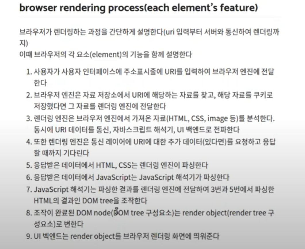 : 브라우저 엔진이 요청한 URI를 받아서 서버에 요청한 후, 응답받은 데이터를 받아 통신 레이어, 자바스크립트 해석기, UI 백엔드에 파싱 후 전달한다.(보다 자세한 설명은 바로 밑의 '브라우저 렌더링 프로세스' 참고)