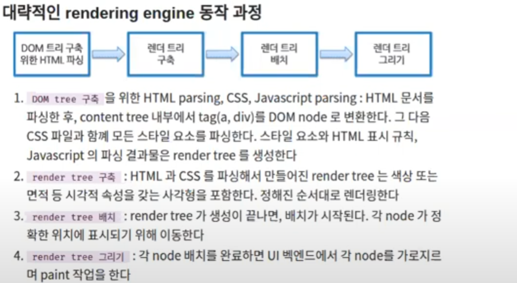 3. 만약 자료 저장소에 없다면(즉 처음 요청해서 불러오는 데이터라면) 렌더링 엔진에 사용자가 입력한 URI 값을 전달함. 그와 동시에 렌더링 엔진은 브라우저 엔진에서 전달받은 자료(Html, css, image 등)를 분석한다.