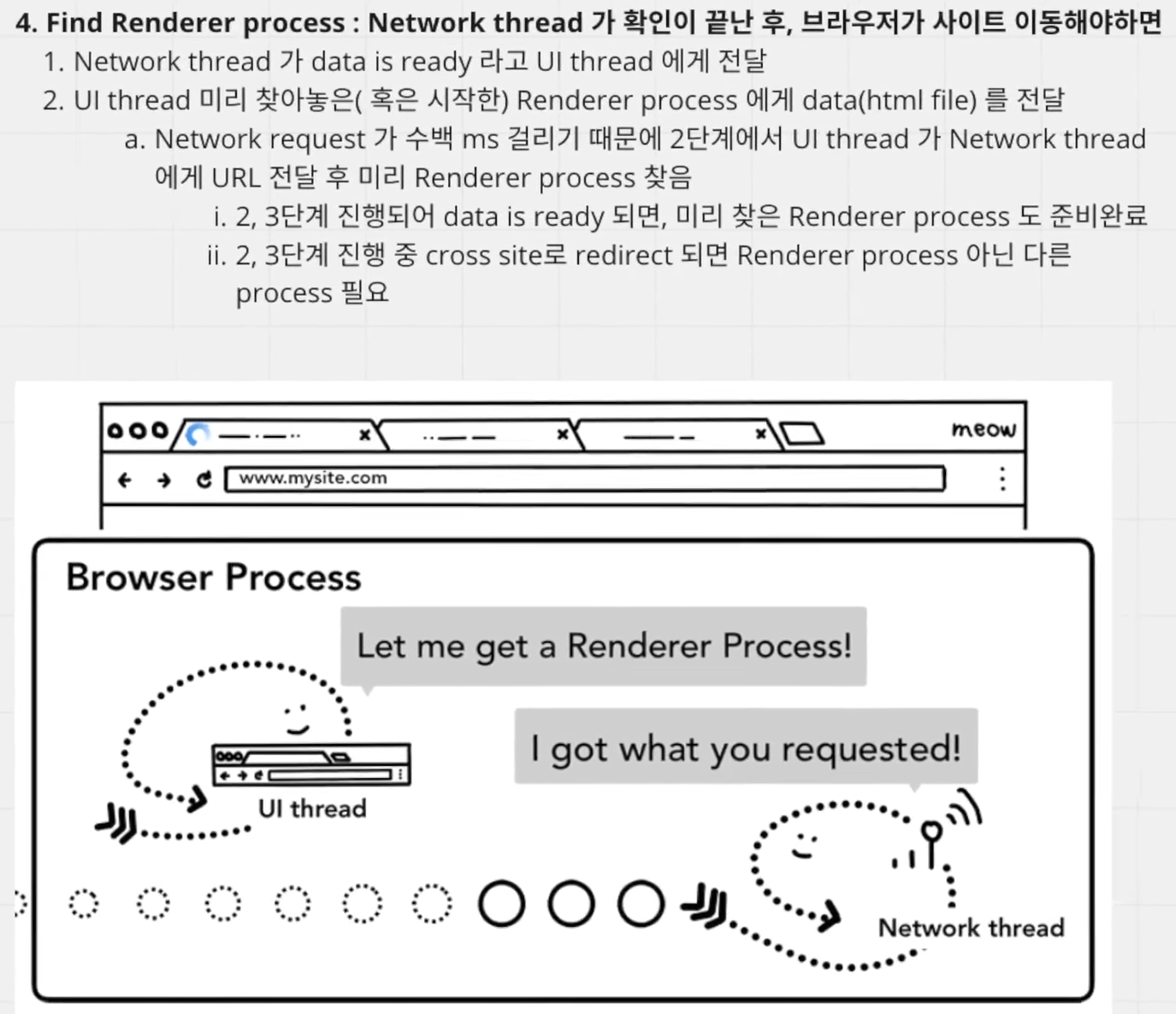 4. Find Renderer Process: network thread가 확인 끝낸 후, 브라우저가 사이트 이동해야 한다고 판단이 선 후 진행.