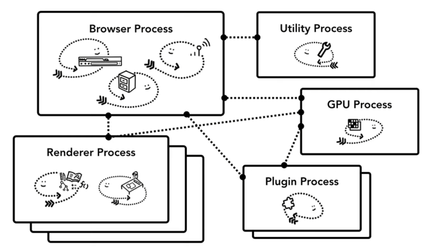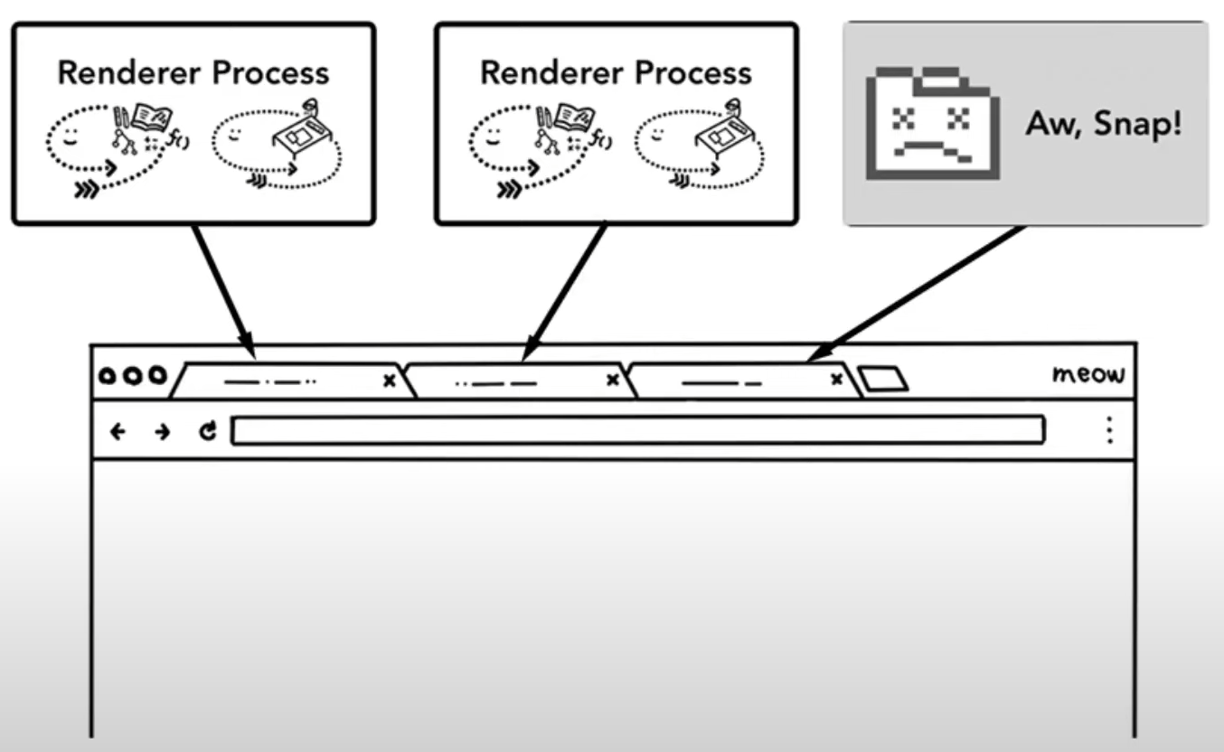 1. 각 탭 당 1개의 렌더러 프로세스가 존재하기 때문에 하나의 탭에서 오류가 발생해 강제종료 시키더라도, 다른 탭에 영향을 미치지 않는다.(프로세스는 각각 메모리 공간을 할당받으므로 서로 영향 미치지 않기 때문에) 또한 보안에도 좋다.
