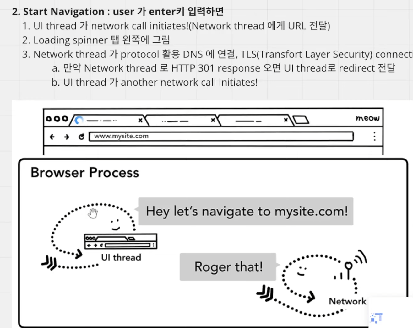 2) UI 스레드가 Renderer process에 전달. - *이 때 Renderer process는 4단계에서 찾는 것이 아니라, 2단계 start Navigation 단계에서 UI 스레드가 Network call을 initiate할 때 찾게 된다. 왜냐면 서버에 접근하게 되면서 Network request 수백ms 걸리기 때문에, UI 스레드가 Network 스레드에 URL 전달 후 미리 renderer process 찾는 것이다.