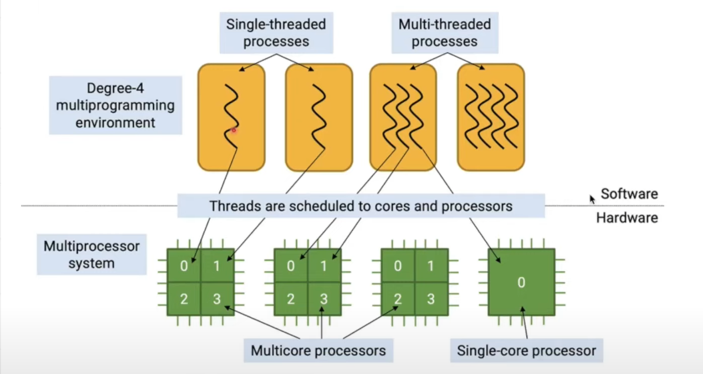 CPU 내의 1개의 코어가 1개의 스레드와 연결(맵핑)된다. CPU도 코어가 1개 있을 경우 싱글코어 processor, 코어가 여러개일 경우 multi core processor이라고 부른다.