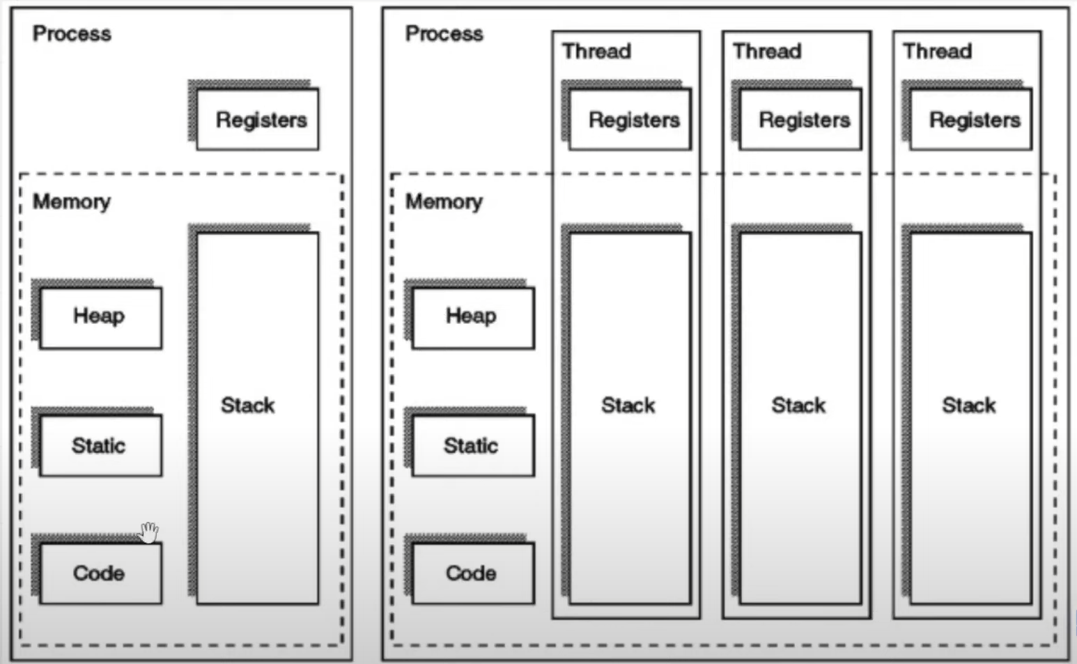 아래 그림을 보면, 왼쪽이 싱글 스레드 프로세스, 오른쪽이 멀티 스레드 프로세스이다. 둘의 공통점은 메모리 영역이 하나라는 것이다. 한 프로세스에는 하나의 메모리 영역이 할당되기 때문이다.