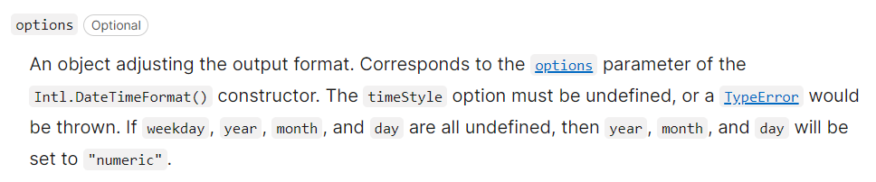 중간에 date.toDateLocaleString에서 timeStyle 옵션을 넣었더니, TypeError가 나와서 stackoverflow찾아보니 나와 똑같은 문제 겪은 사람이 있었다.