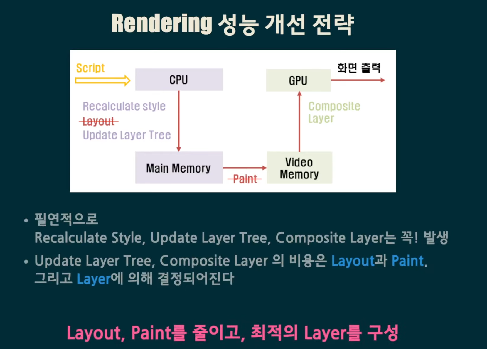 3) script가 들어왔을 때, CPU에서 우선 recalculate, Layout, Update Layer Tree 과정이 일어나고, 그 다음 Main Memory에 이를 저장한 후 pain라는 과정을 통해 Video Memory로 전달하게 된다. Video Memory에서 이를 전달받은 GPU에서 Composite Layer 연산이 일어난다.