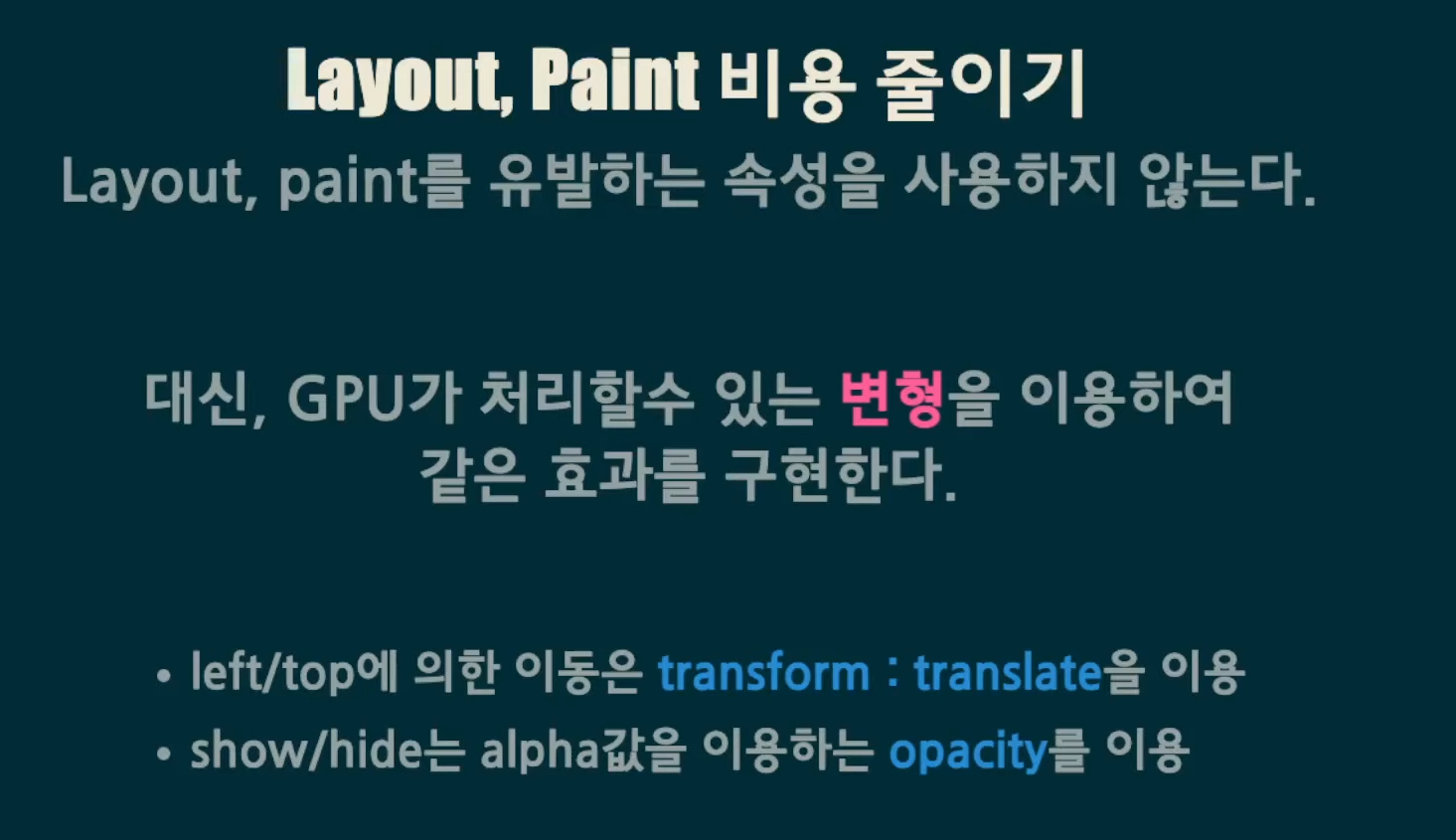 1) Layout(Reflow)을 일으키는 속성들을 repaint만 일어나는 속성으로 대체한다