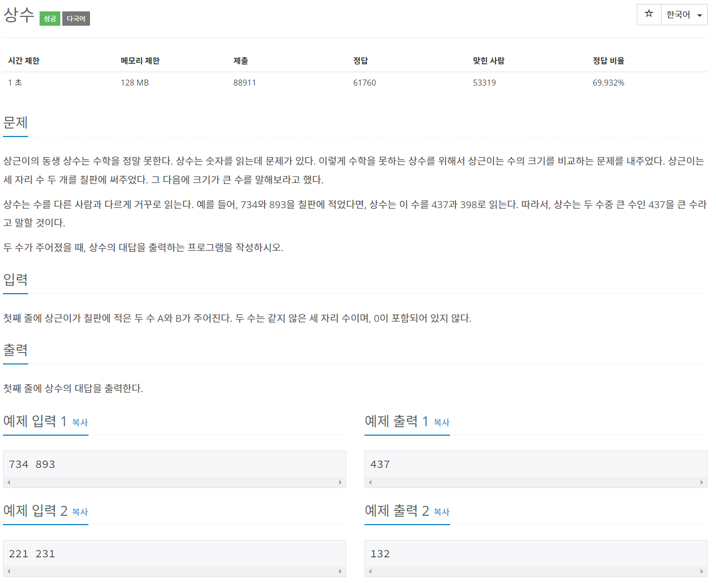 상근이의 동생 상수는 수학을 정말 못한다. 상수는 숫자를 읽는데 문제가 있다. 이렇게 수학을 못하는 상수를 위해서 상근이는 수의 크기를 비교하는 문제를 내주었다. 상근이는 세 자리 수 두