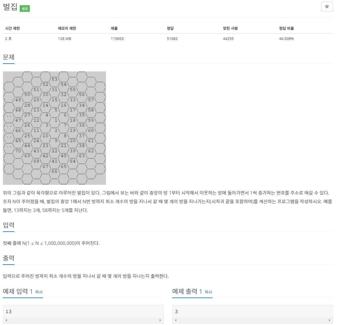 위의 그림과 같이 육각형으로 이루어진 벌집이 있다. 그림에서 보는 바와 같이 중앙의 방 1부터 시작해서 이웃하는 방에 돌아가면서 1씩 증가하는 번호를 주소로 매길 수 있다. 숫자 N이 주어졌